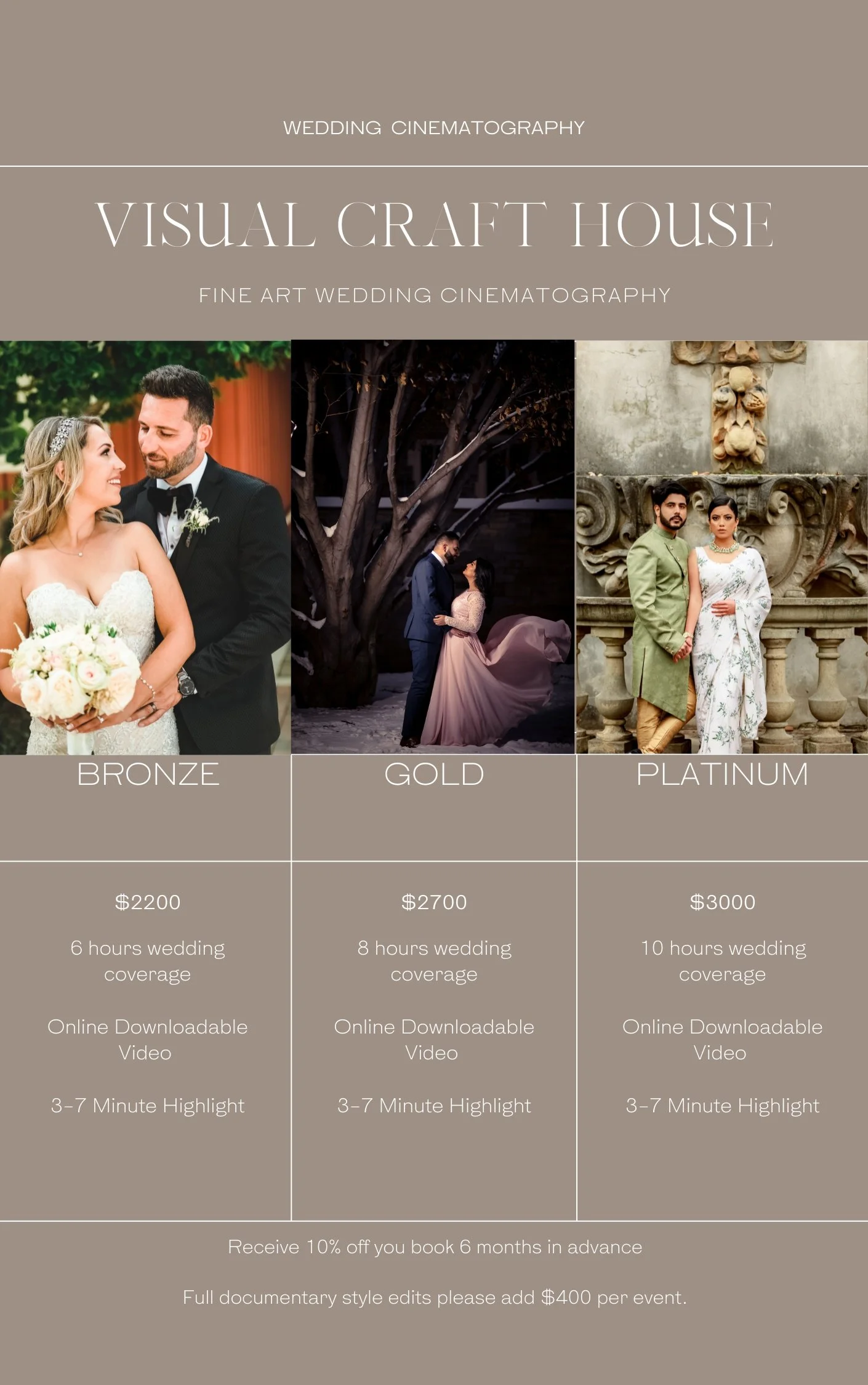 You’re planning your Wedding day that you’ve waited for your whole life! As a piece of the experience we look to assist you with arranging the ideal wedding day by suggesting creative ideas and functional planning. All of our cinematography and photography package pricing are fixed. We provide fair and upfront pricing but we understand not all weddings are tailored the same. We do provide custom packages for multi-day weddings. Please contact for more information. We invest heavily in our work and remain confident that you will be pleased with your investment.